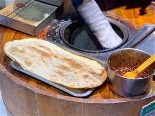 锅盔是湖北的特产,师傅动作熟练地揉着富有弹性的面团子,摁平之后再抹上芝麻,贴在锅炉壁上烤制。有好多种口味,最受欢迎的就数梅干菜了~千万不要以为只有梅干菜,里面还有肉肉哦~现烤现卖现吃才地道的美食!一口酥脆、焦香,都来自这薄薄的身材!趁热吃才会满嘴香!边走边吃,轻松吃一个是没问题的!