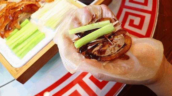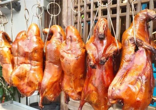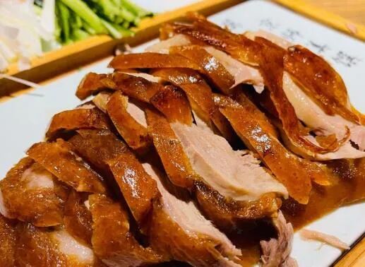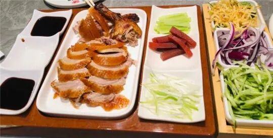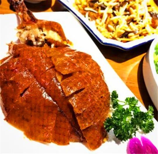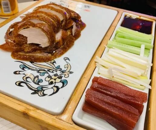 店门口挂满了一整排金黄滴油的烤鸭,脆皮烤鸭,标配的葱丝、黄瓜条、山楂糕、甜面酱、满族辣酱、白砂糖。卷着吃蘸着吃都好。