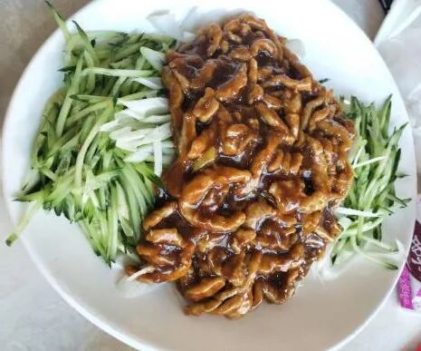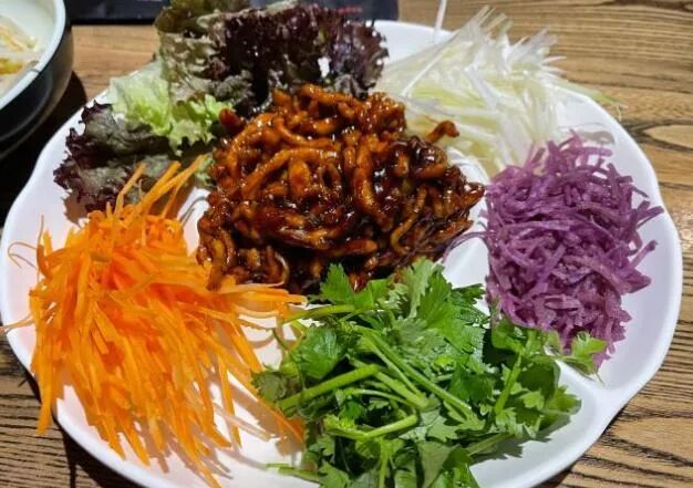 京酱肉丝咸甜适中,酱香浓郁,还带有一点微甜。再加上各种配菜,满满当当摆一盘很是丰富,用来卷饼吃当然是超合适。