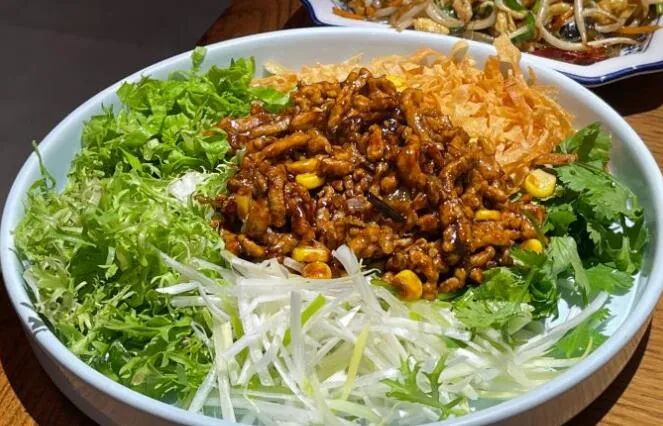 京酱肉丝,超级大一份,配菜也很丰满,新鲜时蔬辅佐香菜葱丝等,用春饼替代了传统豆皮,裹上肉丝与葱丝以及特制薄脆。入口肉质细嫩,酱香浓郁,还带有一点微甜,细细咀嚼,层次感非常鲜明。混合的每种滋味都让人欲罢不能!