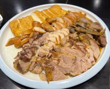 酱鸭子是它家的特色,有点酱焖的样子。京冠熏肉味道也不错。
