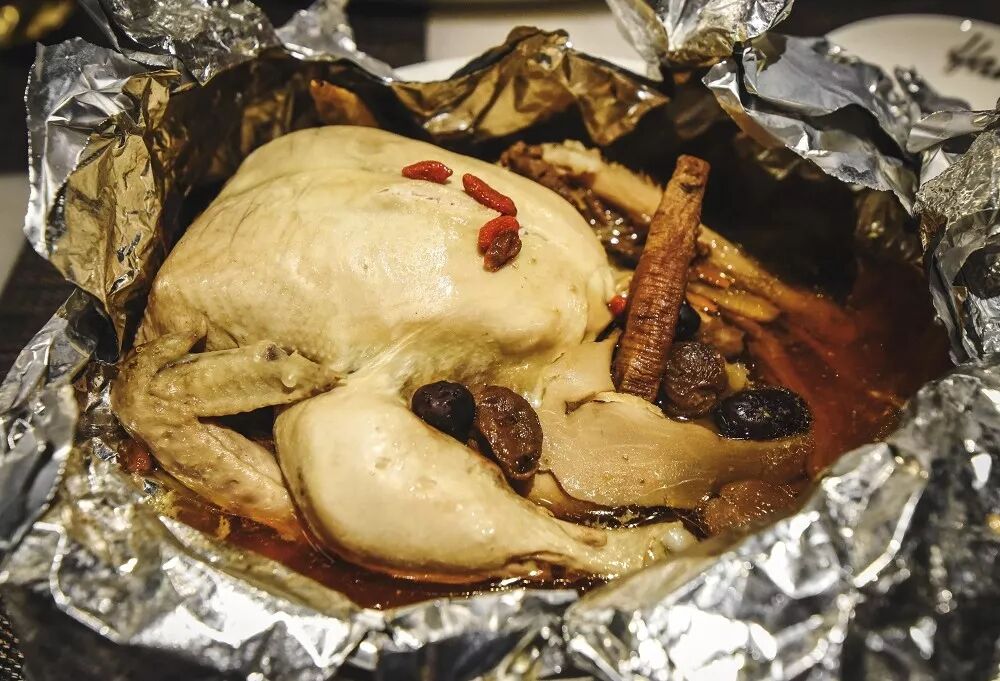 餐厅新的招牌菜,这道菜老店好像是没有的。药材鸡是新加坡的鸡料理,用各种药材与整只鸡一起蒸出来的。鸡肉被蒸的极嫩,用筷子就能剔骨吃肉,而鸡汤鲜而清美,适合喜欢清淡口味的朋友。整道菜夹杂的药膳的清新香气,是养生健康类的大补菜。不过同样是限量菜,卖完就没有了。