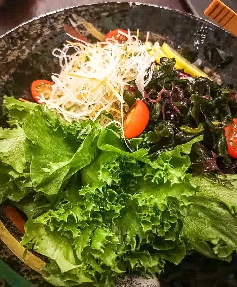 简单如沙拉,却有着苛求的食材品质。每一种蔬菜都新鲜至极,甚至来自日本空运。最令人印象深刻的是这生菜,仅仅只是用镊子夹一下就会发出清脆动人的咔嚓声,这种听得见的脆度和口感让人兴奋不已。