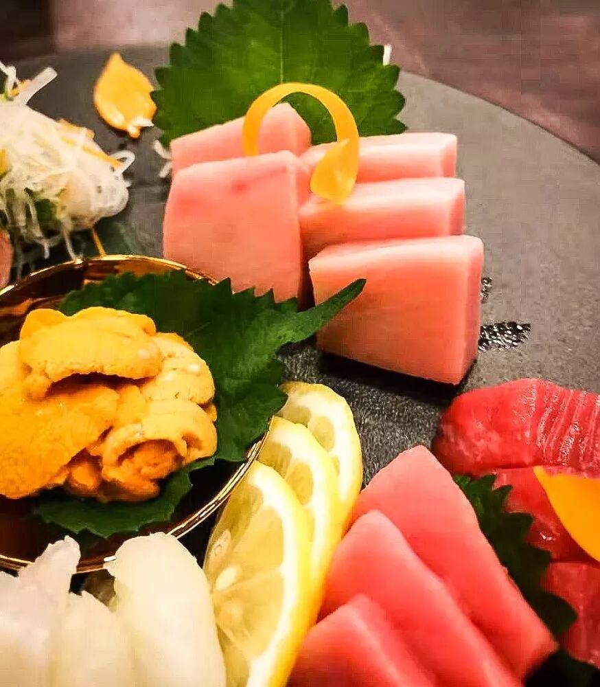 日料对食材新鲜度的要求非常高,更别提"怀石"了。湖畔亭的刺身并非每天都一样,要看当天到达的鲜货有哪些,所以很多食材可遇不可求。我吃到的部分最惊艳的要数这片吞拿,取材金枪鱼最金贵的鱼腹"大肥"部位,色泽如肉色粉嫩,纹理均匀,脂肪丰富,有入口即化的惊艳感。而海胆也是迪拜罕见的海鲜食材,充满大海的气息,只是即便是湖畔亭也并非常备物。