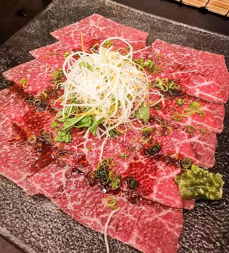 并不是所有牛肉都适合生食,但A5和牛无疑是制作牛肉刺身的上品。好的食材根本不需要过度加工,生牛肉,搭配特调的芥末辣酱,几滴酱油,配萝卜丝就能直接吃了。A5和牛油润和入口即化的口感体现的淋漓尽致。