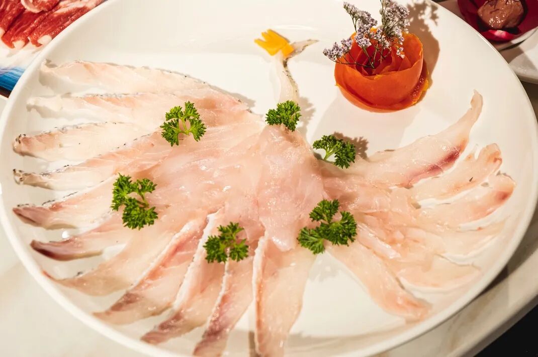 摆盘太美了,鱼片组成一只开屏的孔雀,鱼肉被切的极薄可透光,晶莹剔透,原汁原味,稍微涮几秒就一定要拿上来了,能吃的出其鲜嫩的口感。