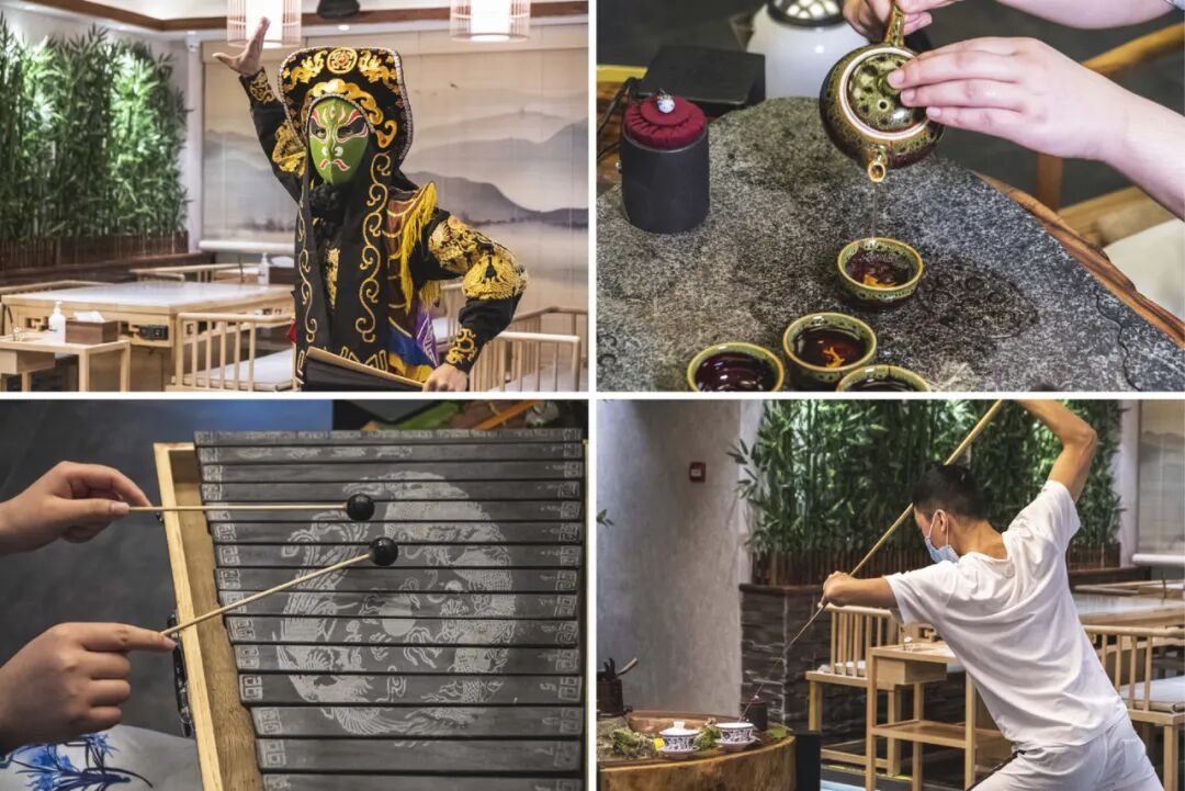 一眼便让人印象深刻,而穿插其中的功夫茶艺、京剧变脸、石琴演奏等等传统中国文化表演,也让整个就餐体验赏心悦目。
