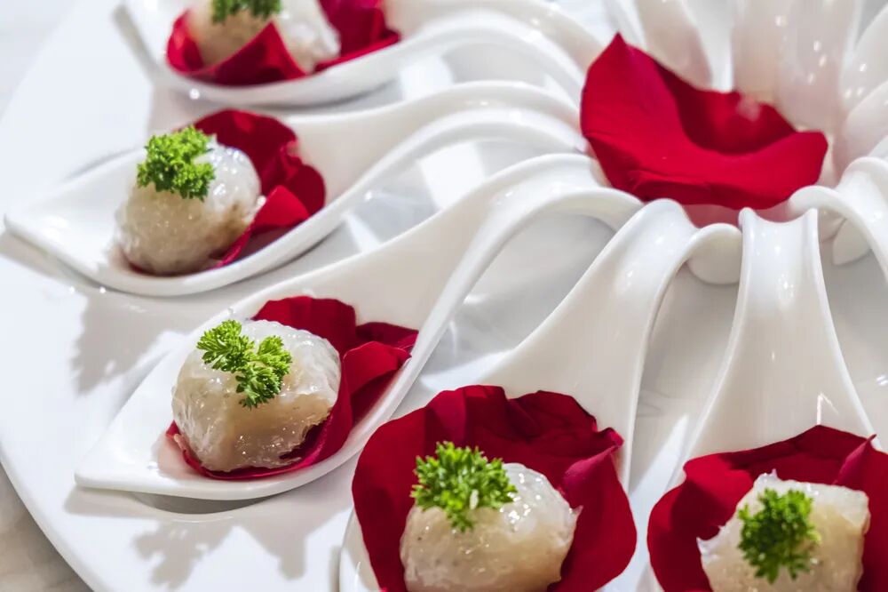 同样有着华丽的摆盘,每一个丸子里居然也都夹在着玫瑰碎花瓣,真的是内含彩蛋。摆盘里的花瓣也可包裹着丸子一起入锅,香气十足,肉质也是超级Q弹。