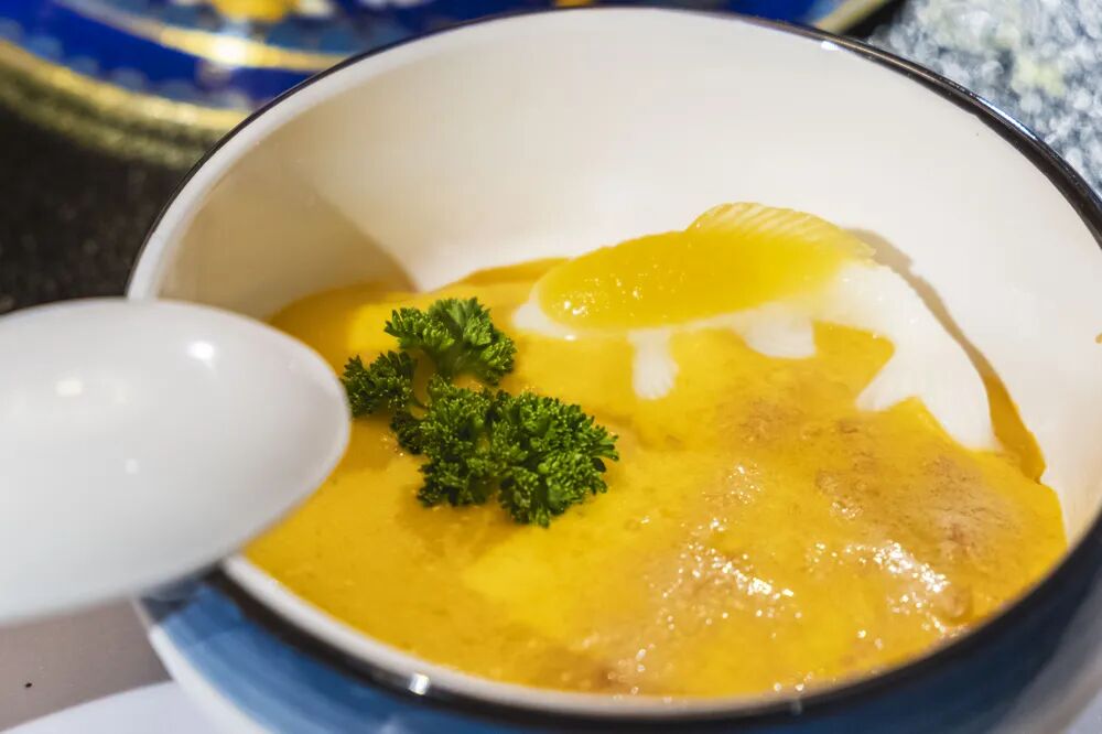 这道甜品一上桌就吸引着小编的注意力,尤其是用牛奶布丁做的那条小锦鲤,萌到舍不得吃。它和软软的糯米一起被包裹着浓浓的芒果泥包围着。一口下去香甜可口。而这道菜还有一个让人意想不到的彩蛋,吃过后你还会发现舌根似乎跳个不停,不要怀疑,这就是你童年时候的味道 —— 跳跳糖。