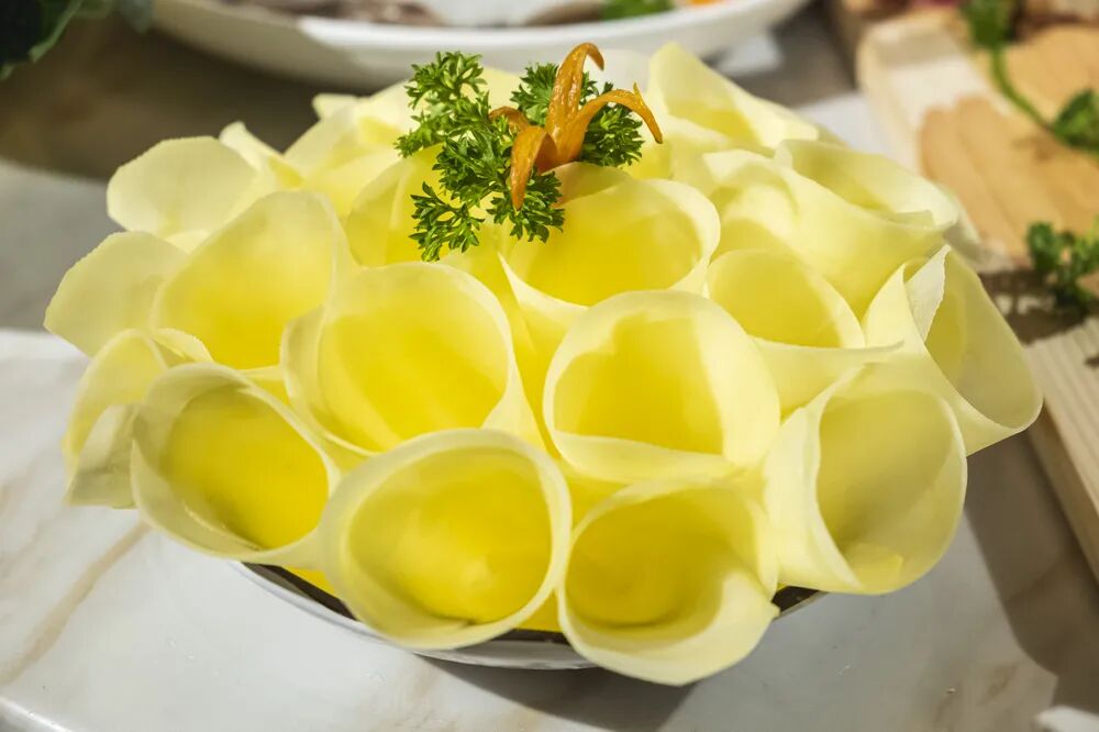 虽然土豆片本身过于平常,但这里的土豆片非吃不可。由厨师亲自设计摆盘,如一束黄玫瑰般地绽放。将土豆片切得薄如纸,放入火锅烫5秒即可享用,恰恰有香脆可口的味道。