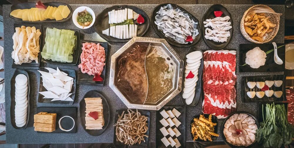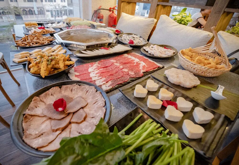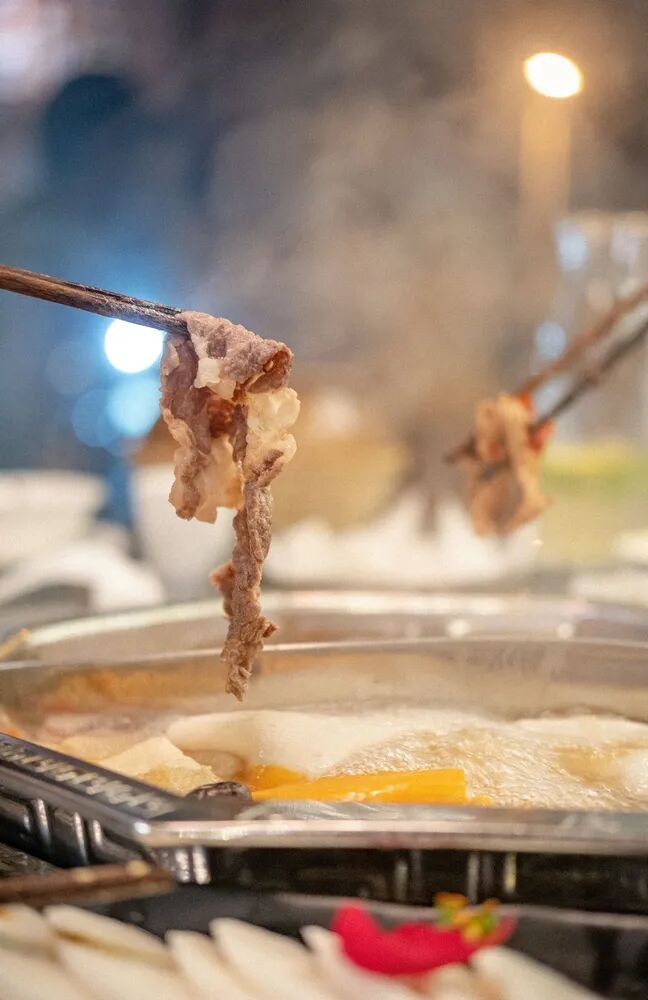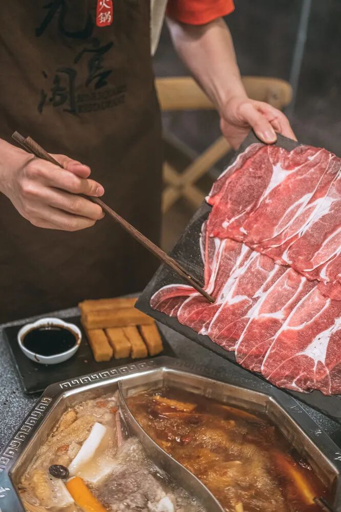 涮品上,涮肉首推美国安格斯牛眼肉,新鲜的牛肉被切得轻薄如翼可透光,纹理漂亮,涮个几秒钟即可捞起大快朵颐,无与伦比的口感和味道尤其令人上头。