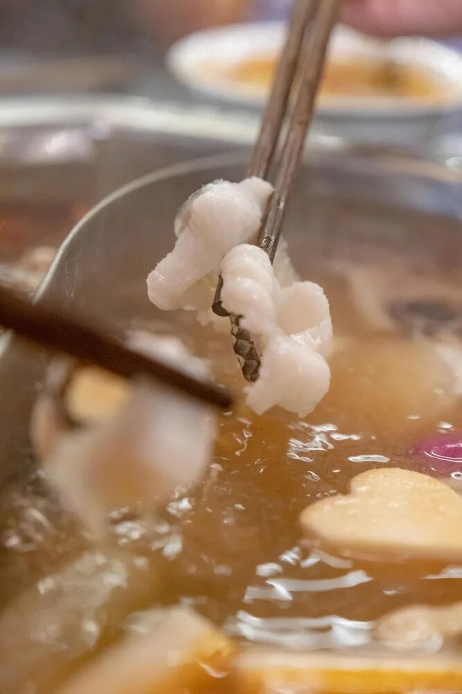 黑鱼片也是强烈推荐的,每片鱼肉薄厚均匀,晶莹剔透,带着一点点鱼皮,用筷子夹着放入锅中只需烫几秒,就能获得非常好的口感,Q弹爽口,也无鱼刺。另外毛肚、鸭肠、虾滑等也是不可或缺的涮品。