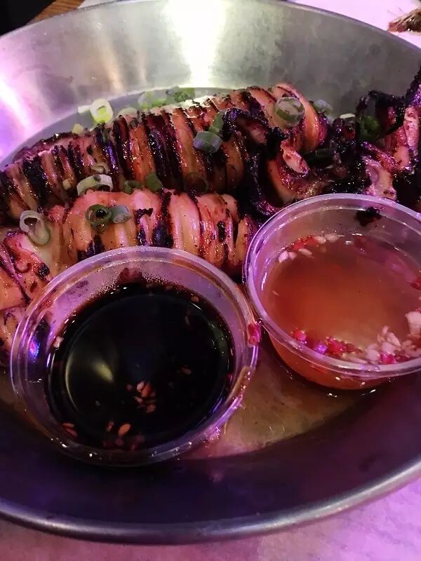 而其他菜式也运用煎烤加刷酱汁的方式烹饪,口味不俗。比如我们单点的烤鱿鱼,本就已经入味三分,再配合两种酱汁一起更具风味。