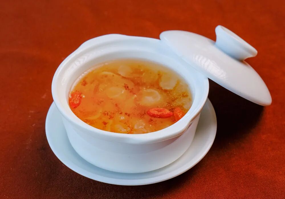 这是一碗甜汤,仅仅听名字就充满着浓浓的养生感。安南子有清热润肺,利咽解毒,清肠舒胃的功效,而天山雪莲更是可养心通脉,清肝明目,健脾滋肾。很适合餐后来一碗。