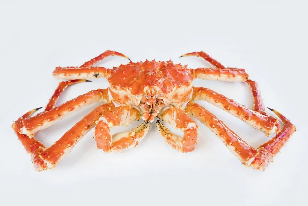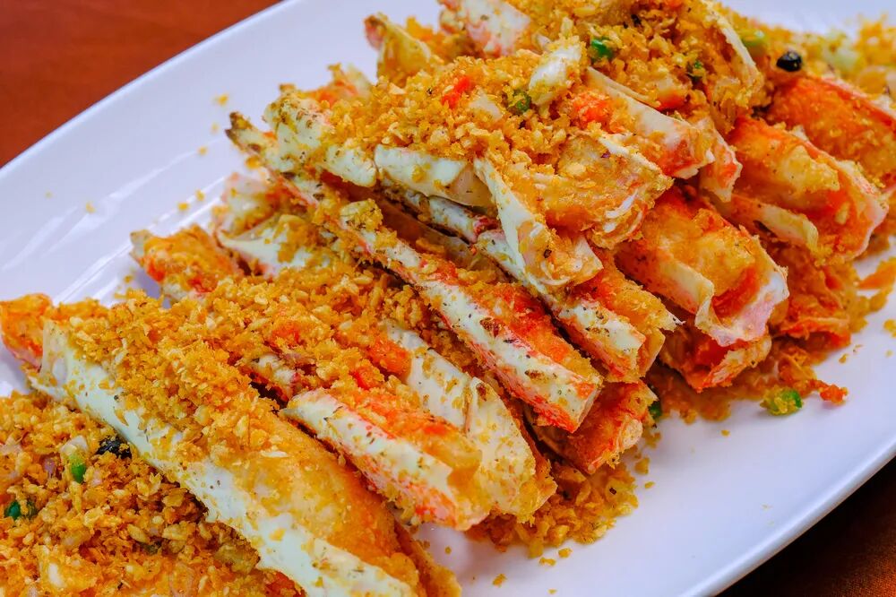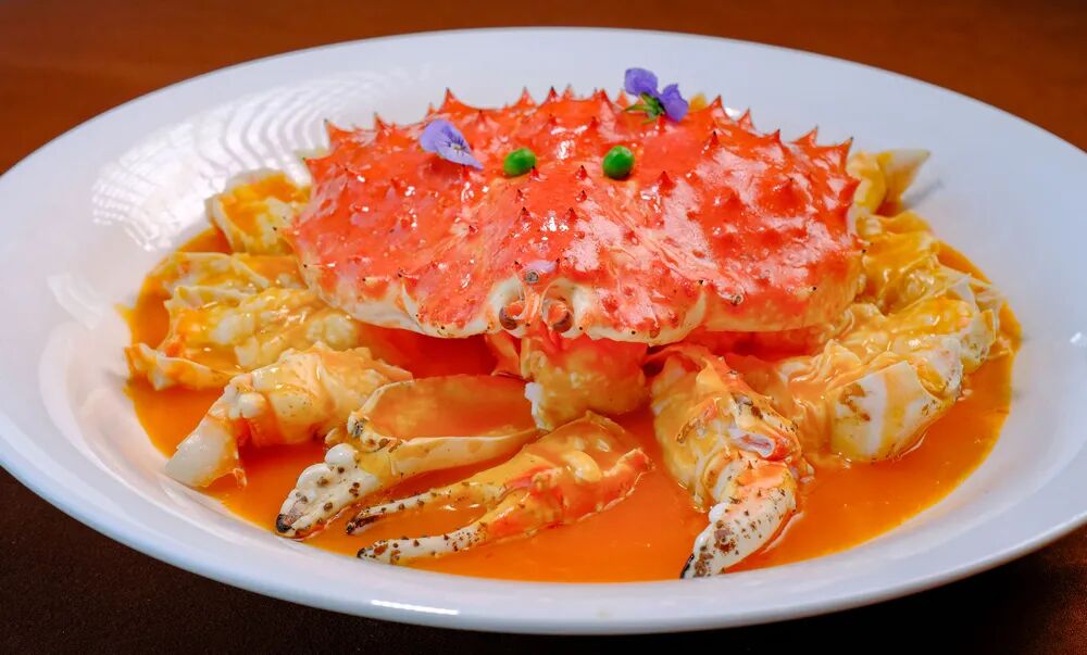 帝王蟹太大,一般可两吃。蟹腿可用避风塘做法,其精髓是蒜蓉的独特风味,甘口焦香,脆而不煳,蒜香味与辣味、豉味结合,达到口味的平衡。与肥美的蟹肉共烹,味道和谐,可口极致。