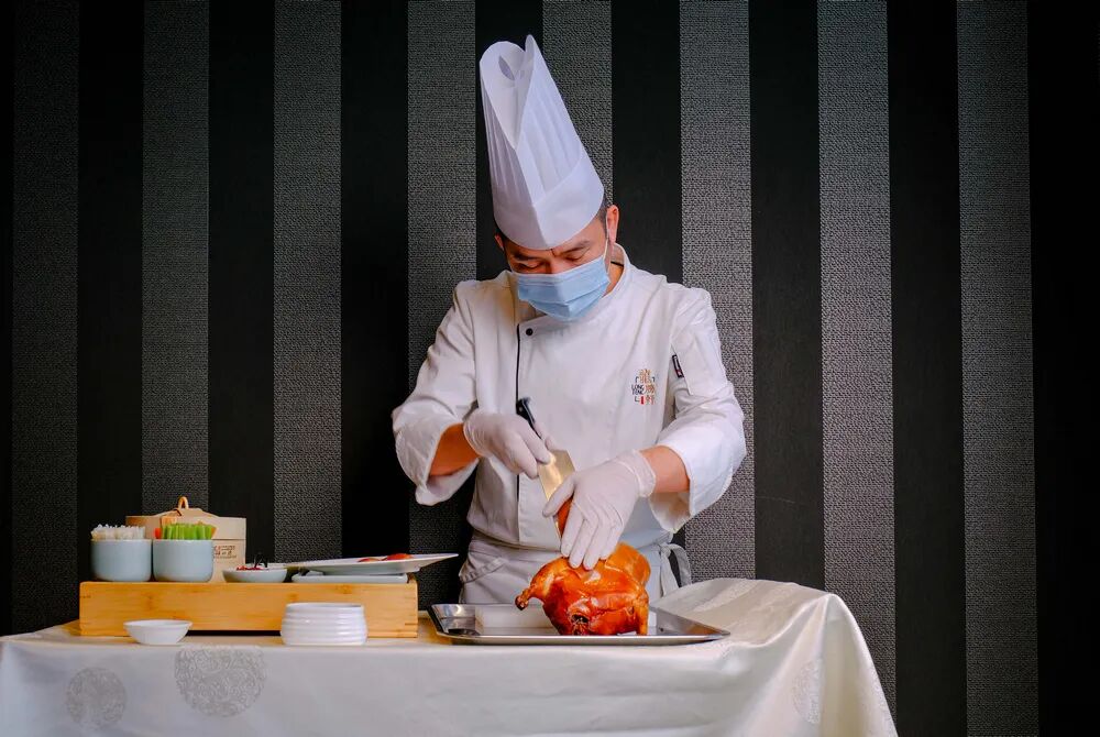 为了一口正宗的北京烤鸭,龙腾轩特别在露台盖了烤鸭房,特别选用东南亚的清真鸭子,传统工艺的烹饪,专业师傅的现场片皮,每一步都严格把控。口味已几乎能做到和北京一模一样。
