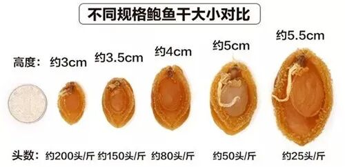 干鲍鱼还有另外一个重要指标,就是"头"数。我们常常能听到"几头鲍"这个说法,但这个"头"并非数量,而是衡量干鲍尺寸的一个计量单位。所谓"头"指的是"一司马斤(约600g)里有大小均匀的鲍鱼多少只"。