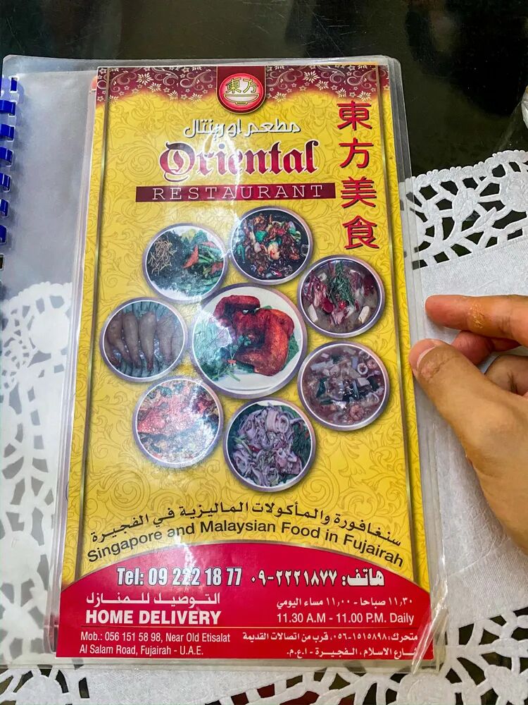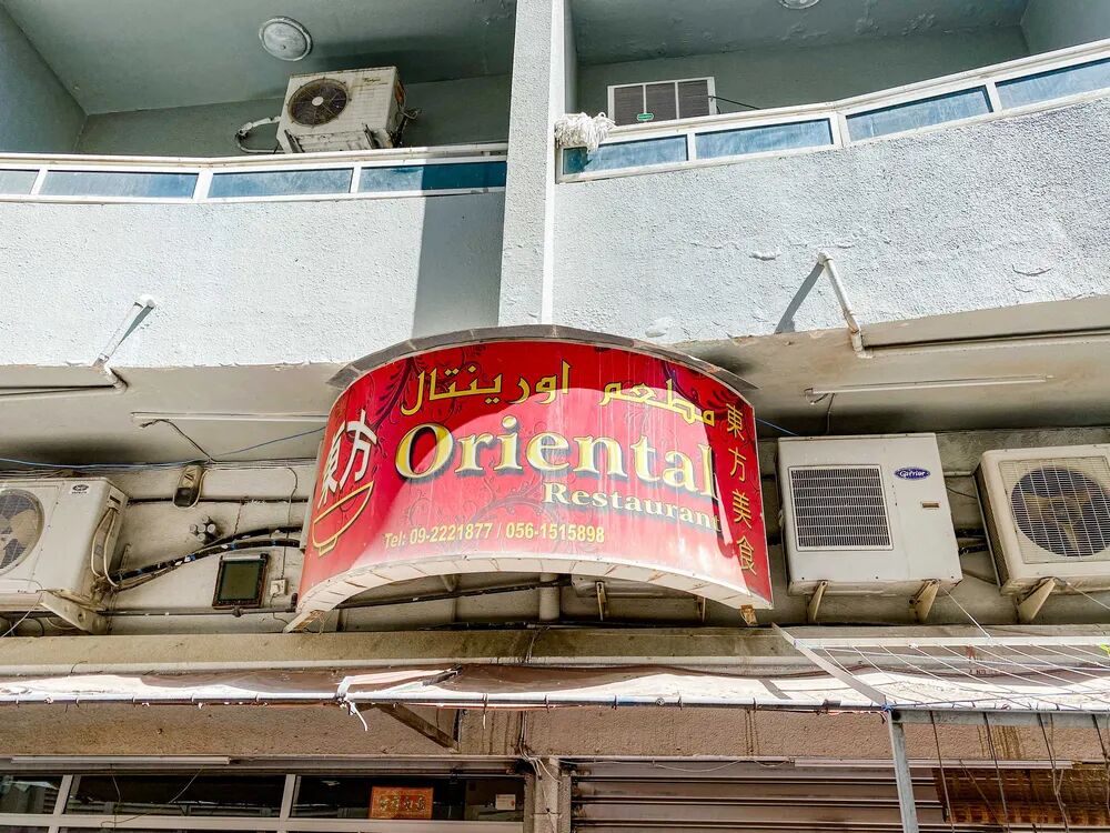 这家名为东方美食(Oriental restaurant)的餐厅听名字就能让人产生浩瀚的联想,让我想起全球著名豪华酒店的文华东方。为此我们还隆重地打了一个预约电话以示体面。而到地方才会发现幻想破灭,这“东方美食”餐厅实则破得一匹。若不是门口几个“东方美食”的中文大字,很容易与遍布阿联酋的印度小馆子划上等号。