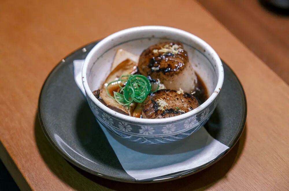 这道小菜外表像是在轻煎后用火烤了下,尝起来有淡淡焦香,里面却很鲜嫩,应该是用黄油微煎后,淋上日式Teriyaki酱油,有点像日式腌鱼生的做法,只是去掉了柠檬汁的酸劲。