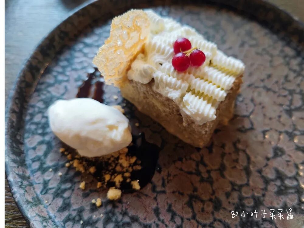 前菜和主菜已经吃到肚歪歪,甜品上场了,本来以为自己吃不下了,想说就吃一口尝试一下,然后又真香了。右图这个咖啡蛋糕配香草冰淇淋也太好吃了吧,图片很难看出来蛋糕体的湿润感,口感就是咖啡海绵蛋糕泡在牛奶里面,湿润绵密,味觉上有种拿铁的感觉,词穷了,反正很好吃,一口气吃了3份。