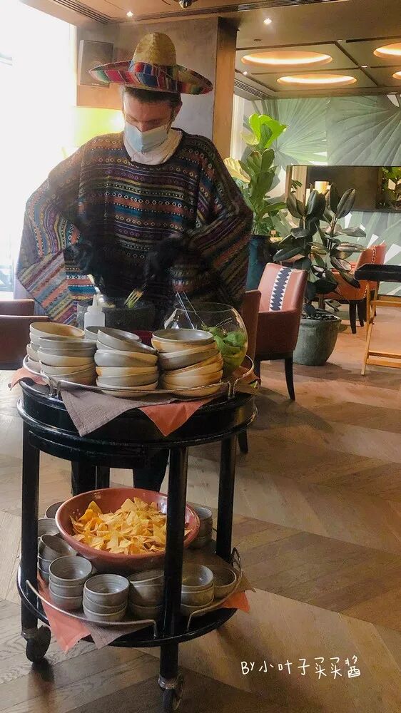 入座之后,这位小哥马上推着车到每桌开始现场表演制作。墨西哥进口的牛油果捣成泥加上新鲜的番茄配墨西哥玉米片,完全停不下来,手不自觉就一直伸向它。