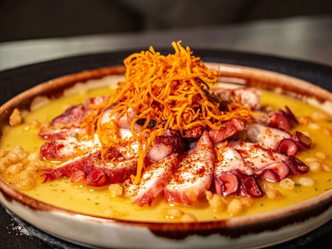 难以想象黄色的汤汁是由橙汁和生姜调制而成,章鱼切片上端配了一些油炸过的红薯条。看似毫无关系的几样搭配在一起,碰撞出难以描述的火花。清甜中带着一丝微辣,Q弹中有混合着脆口。这道菜应该是强烈推荐之一了。