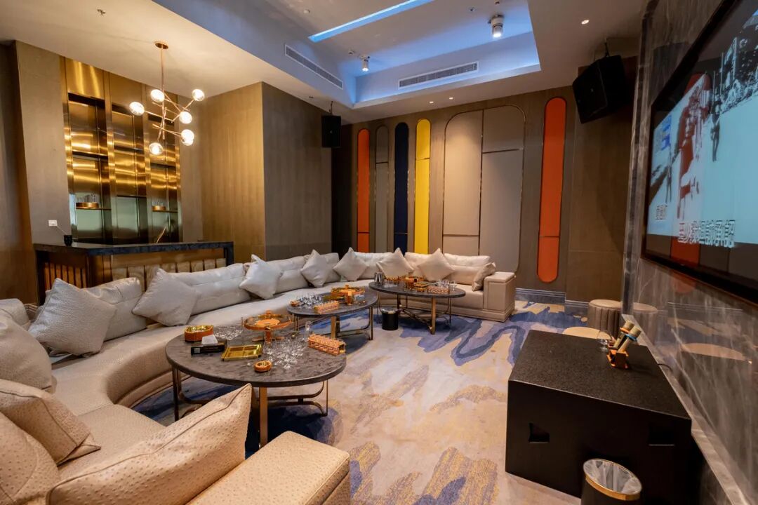 伯爵KTV包含多个有专人服务的包厢,其中大包厢每个可容纳30-40人,采用超大LED屏幕,有一种君临天下的感觉。而在大包厢和中上包厢内都设有小吧台,还可以喊调酒师过来现场调酒。