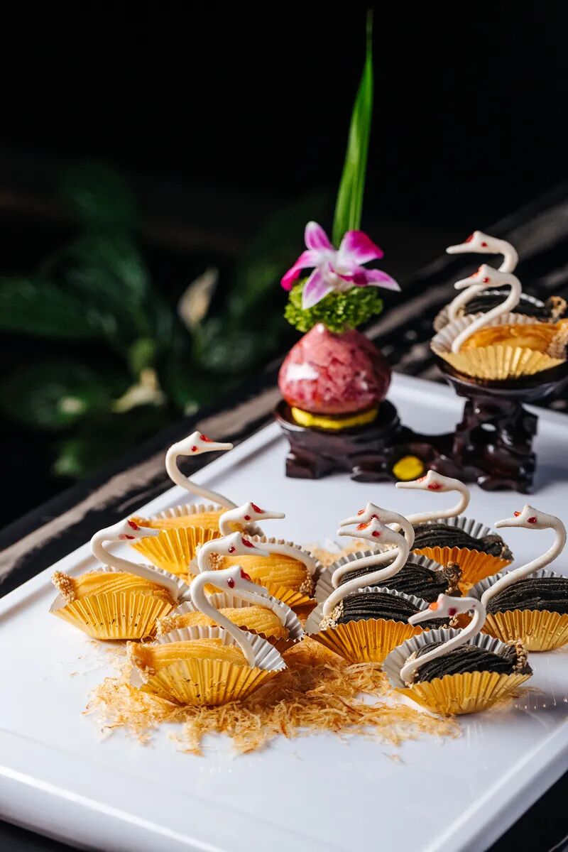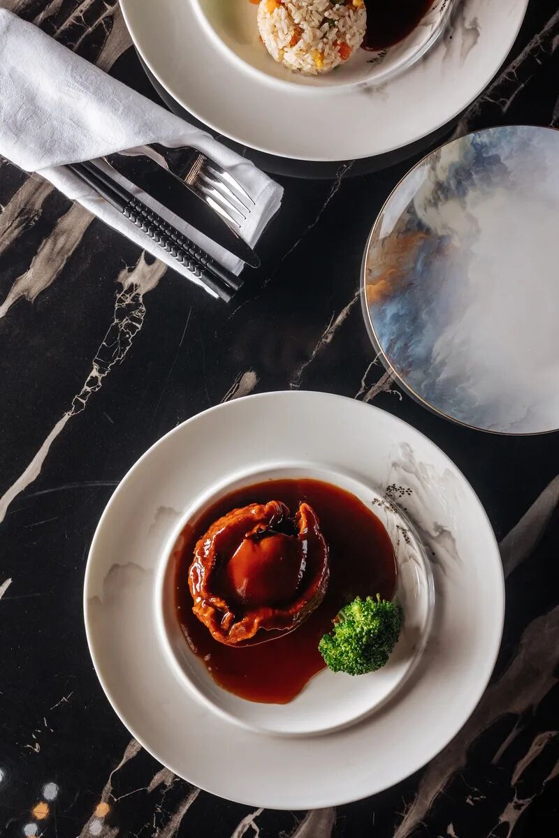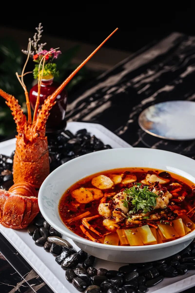 此外,还有水煮龙虾,用水煮鱼的方式做龙虾可谓新奇。榴莲天鹅酥想必是榴莲控的必点。鲍汁南非干鲍或辽参,则都是粤菜里的珍馐。