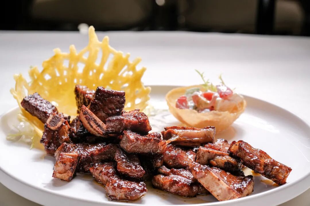 腌入味的牛仔骨双面煎制焦香,脂肪在高温的作用下,油份会均匀渗入到瘦肉中,吃起来不肥不腻、不干不柴,又鲜嫩多汁。
