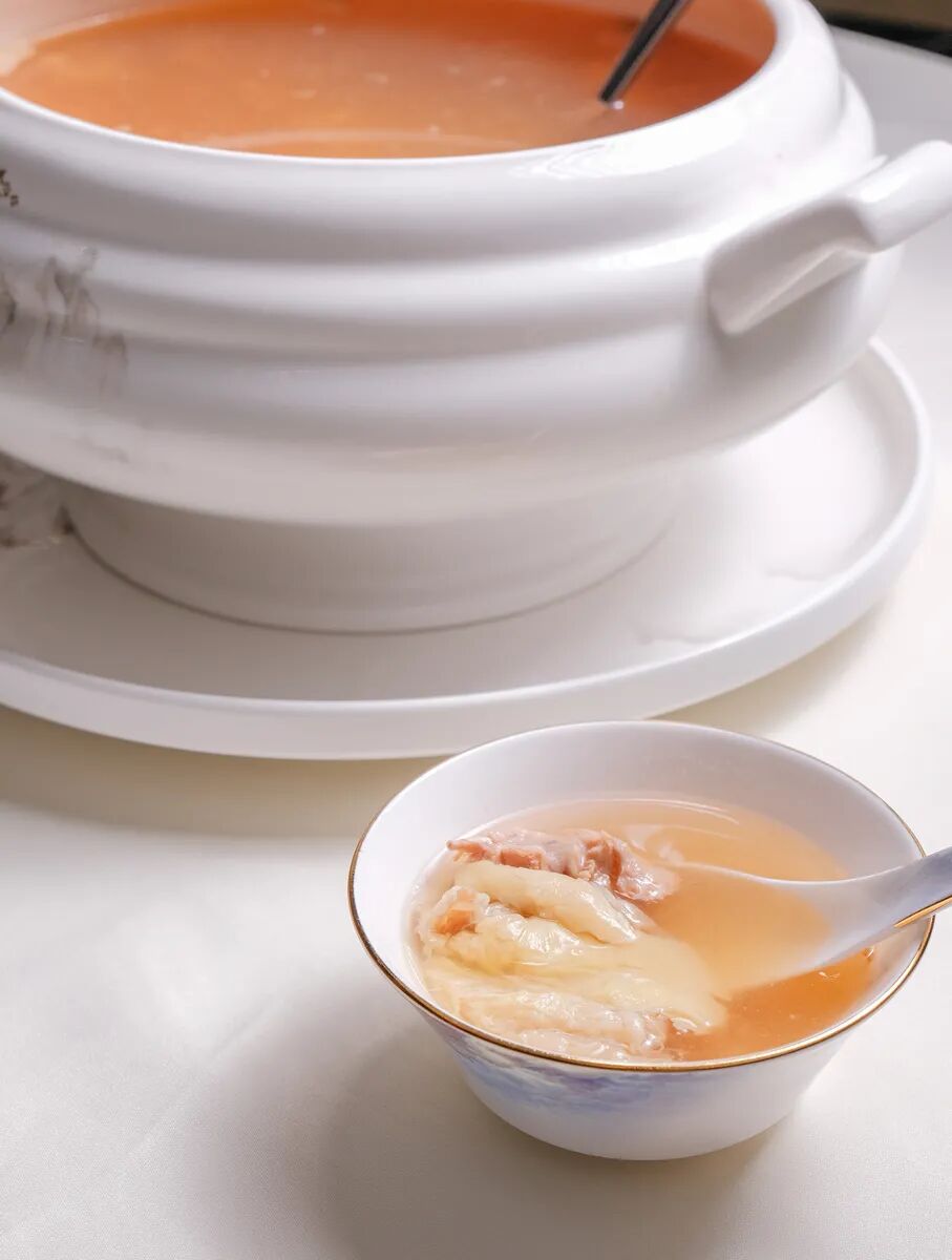这道菜在温州瑞安可谓家喻户晓,此汤补而不燥,性质温和,还具有多种食疗功效,是一道经典的温州菜式。其汤体呈金黄色,口味清甜,后味十足。鸡肉炖得极烂,鲜美的滋味在汤中肆意。另外大家不要太在意榴莲,因为这个汤几乎已经没有榴莲的味道,而榴莲的营养和滋补,已经化在汤水里。