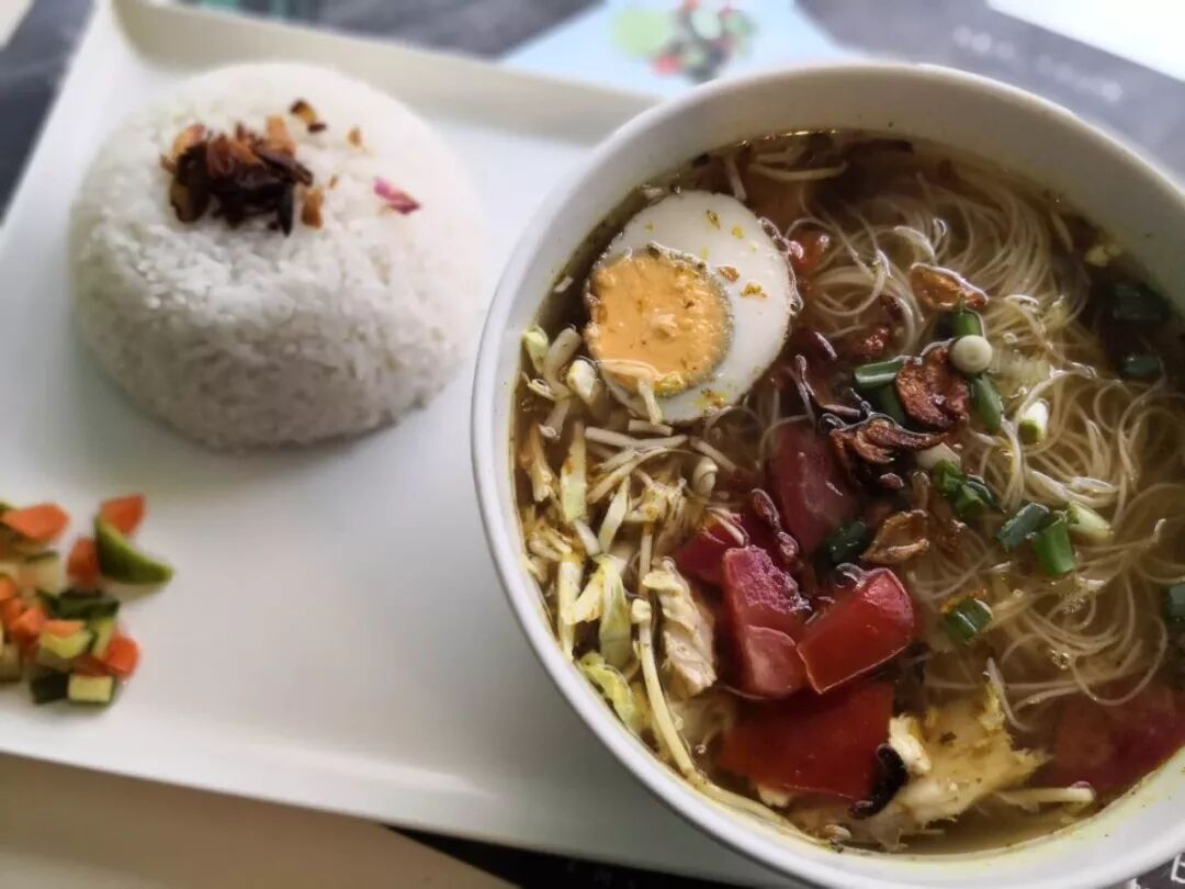 印尼汤粉有着十分清爽的滋味,清雅的柠檬草香气和酸酸的鲜美口感,里面用的是东南亚的细米粉。而且买汤粉居然也送一份米饭,一开始觉得变扭,但没想到把米饭在汤里浸泡一下吃有着极佳的口感。