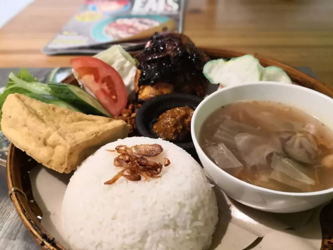 印尼辣鸡饭看着卖相是不错的,搭配挺多,看起来很丰富,盛器从原来的普通碟子换成了更具东南亚风情的竹盘,可见更换包装可以带来多大的增值效益。