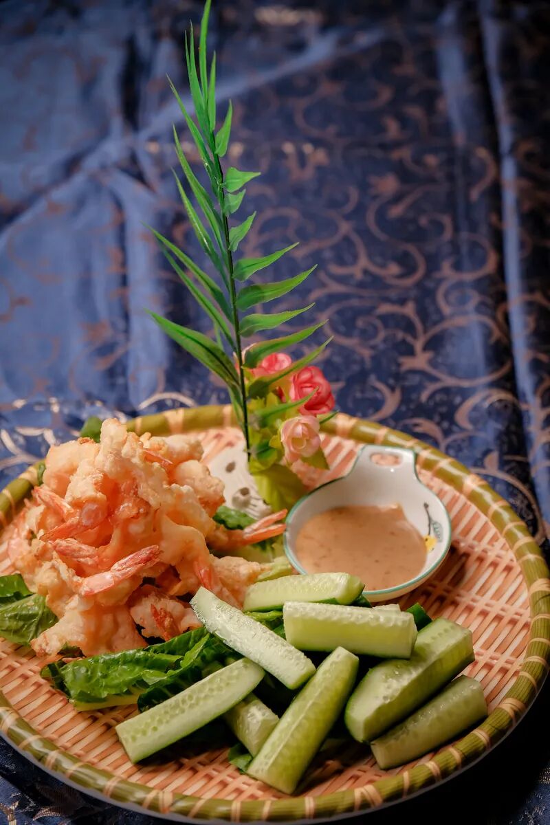 这道菜工序复杂,采用新鲜活虾,去虾壳,再开背去虾线,敲打虾肉,直到虾肉薄如蝉翼,下锅快速炸到金黄上桌,配上秘制的芥末沙拉酱,虾的鲜甜和酱汁,交融在一块,香甜可口。