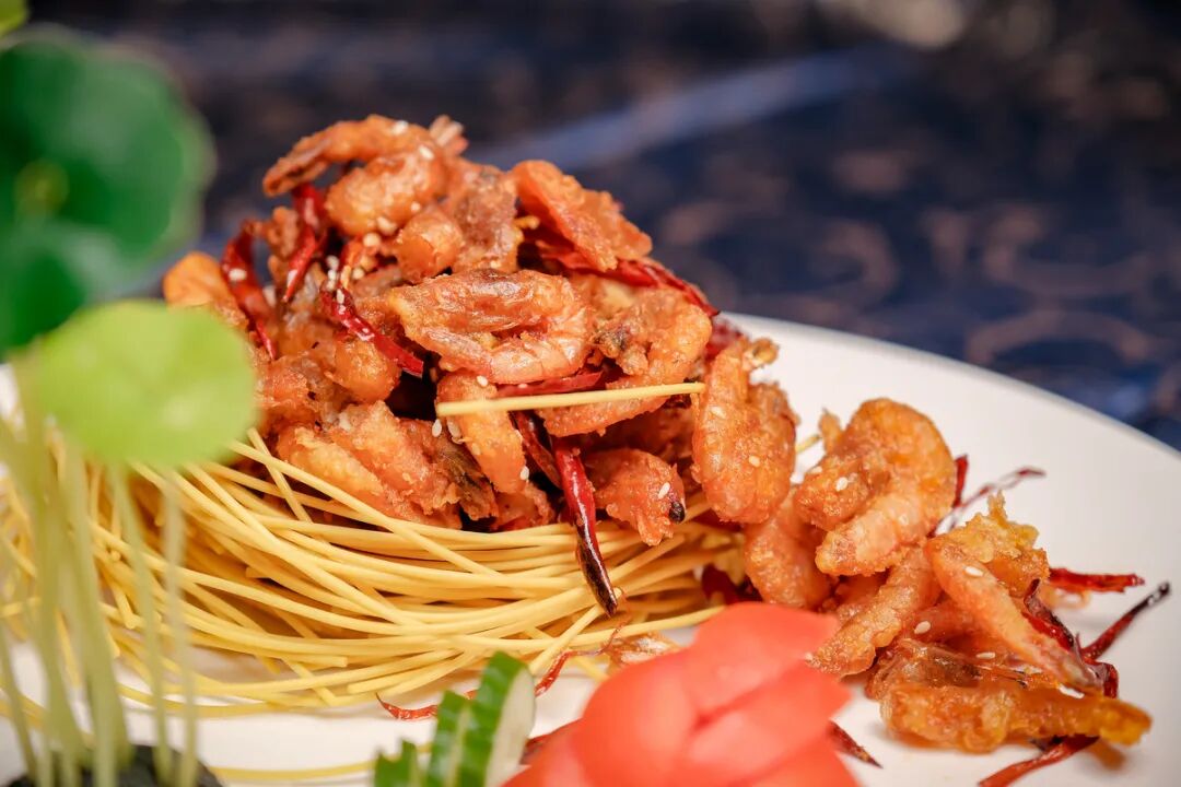 迪拜可搞不到河虾,这里的河虾来自国内空运的新鲜速冻河虾,虾头经过处理后再进行腌制,加秘制酥炸粉,吃起来酥脆饱满,不会干柴。再佐以干辣椒丝爆炒,连壳带肉一起吃,满口香脆。