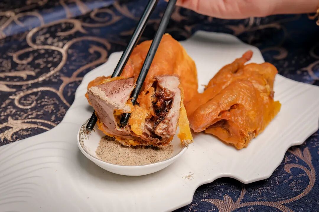 用的是28天左右的乳鸽,重量在5两半。是根据玫瑰豉油鸡改版的一道菜。先卤后炸,保持鸽子肉的嫩滑不会老,再配上特制的椒盐,可谓唇齿留香。