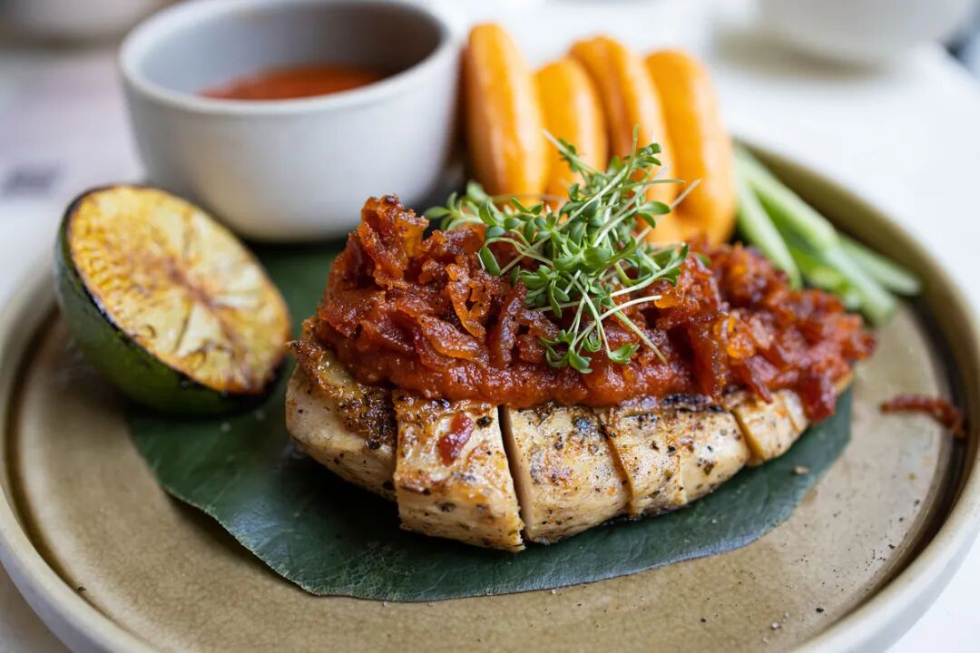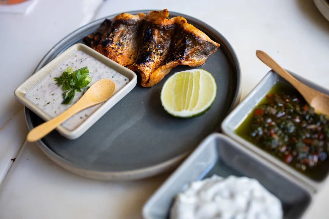 这一道主菜是唯一一道带辣味的,搭配的是薄荷优格酱。鱼肉烤制的火候控制得不错,肉质还是鲜嫩多汁。