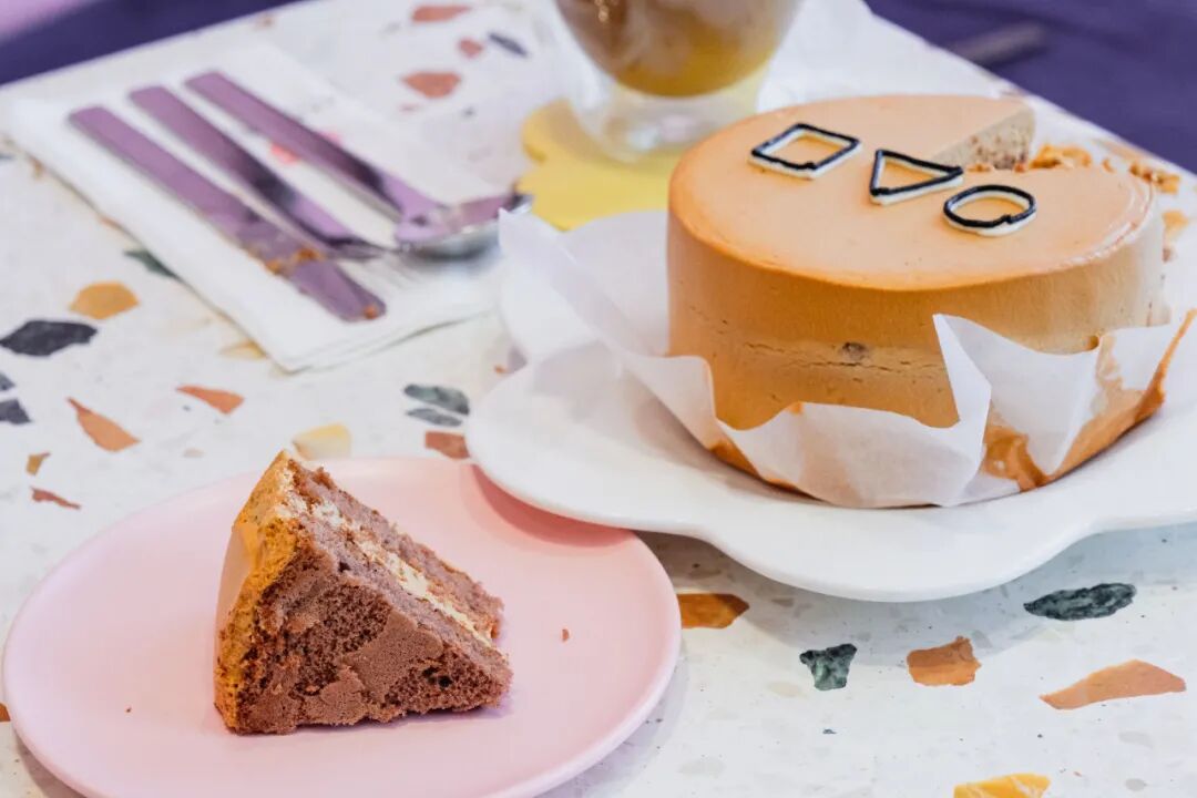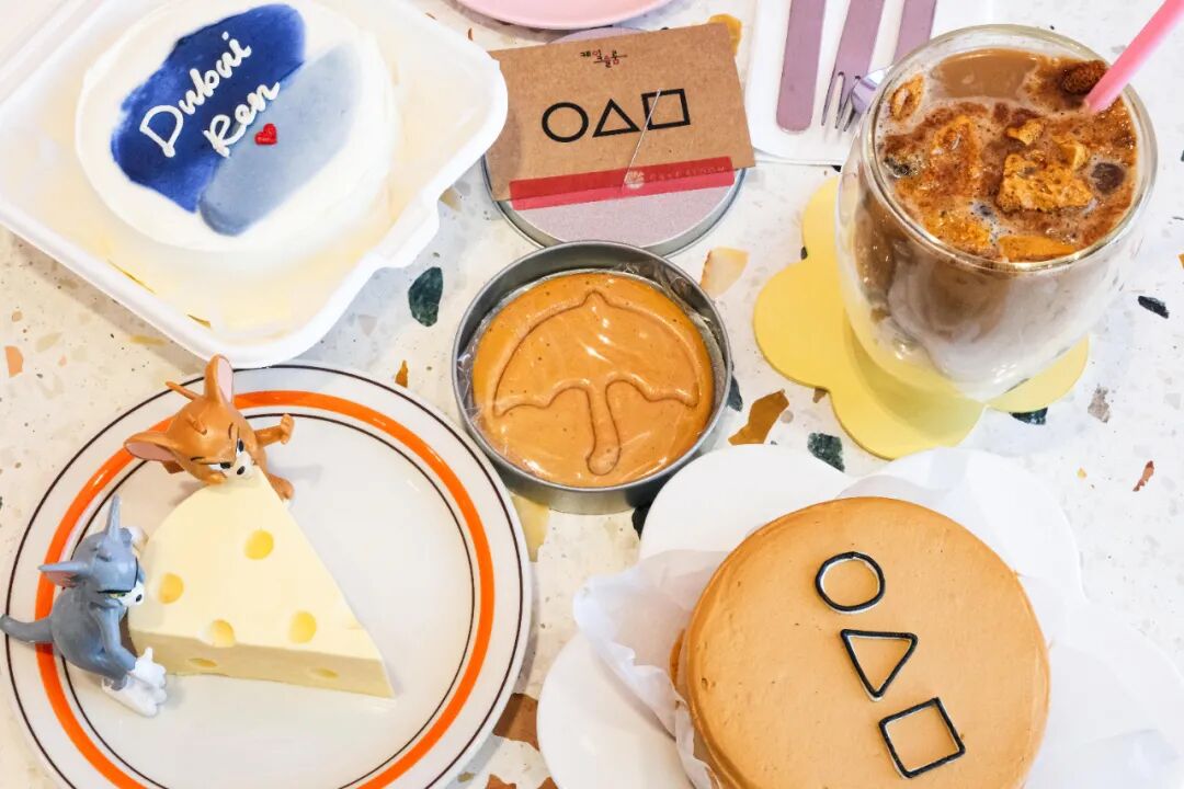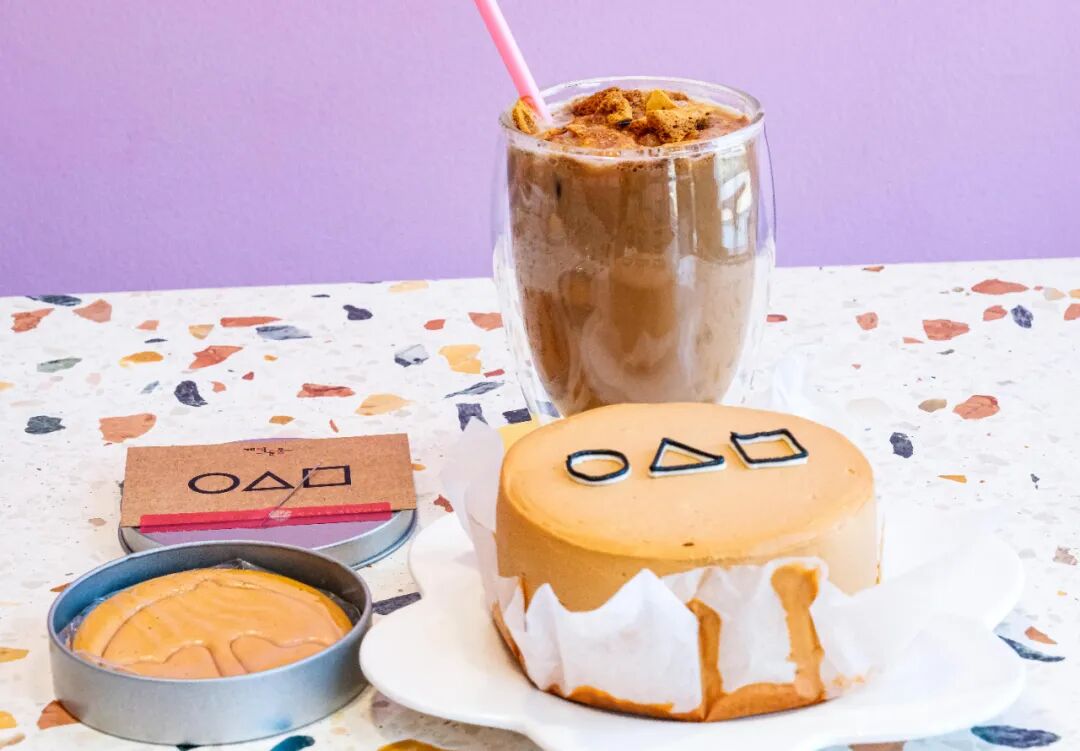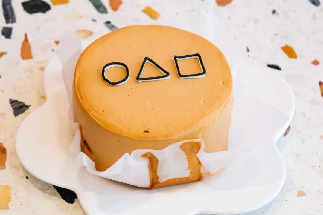 作为一家韩国的甜品店,怎么能不跟风玩韩国热剧的梗呢!前一阵子巨火的《鱿鱼游戏》甜品他家也有,这一款属于套餐。除了《鱿鱼游戏》中的椪糖,还额外配一个主题盒子蛋糕外加一杯焦糖咖啡。