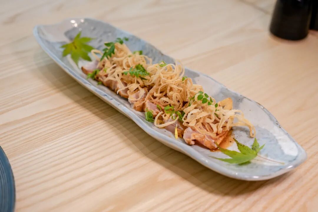 长鳍金枪鱼相对脂肪含量较高,所以使用微炙能激发出更多的肉香,搭配上微酸清爽的柚子醋,少量的柚子皮既去除了腻味,更为整道菜本身添上了一种清香。炸过的甜美又爽脆的洋葱丝又使这道菜有了爽脆的口感,是一道精致的料理。