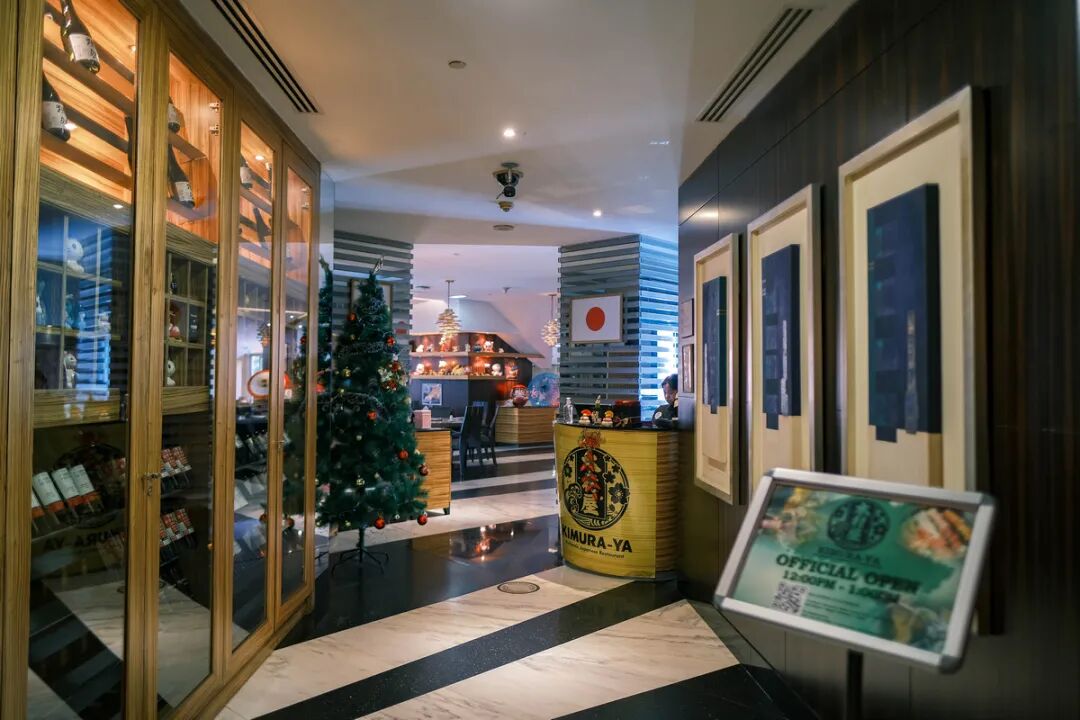 Kimuraya木村屋德拉店沿袭了其传统日式风格与现代室内设计的融合风格,从玄关到室内都有着满满的日式传统元素,既有传统折纸扇也有精美的现代灯饰,整体以深原木色为主,彰显出一种低调而优雅的氛围感,符合品牌的一贯调性。