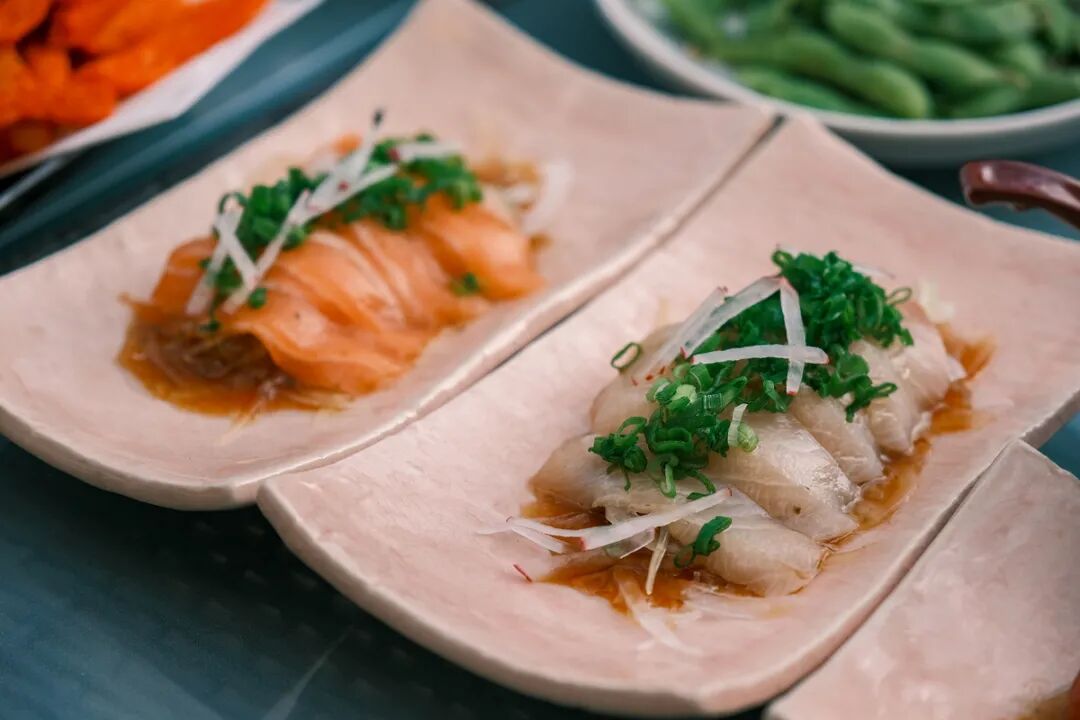 套餐中包含有金枪鱼及三文鱼刺身。木村屋的刺身新鲜甜美,实现刺身自由的快感自不必说。此外我们额外点上了木村屋的招牌刺身金枪鱼中腹以(Chutoro)及黄尾鱼刺身,如果是刺身疯狂爱好者,不妨点上已实现最大程度的满足。
