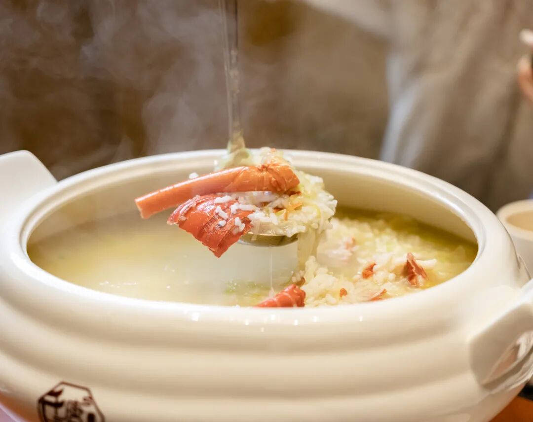 龙虾可以两吃,吃完刺身,剩下的龙虾会做成龙虾粥,让人舒心暖胃。