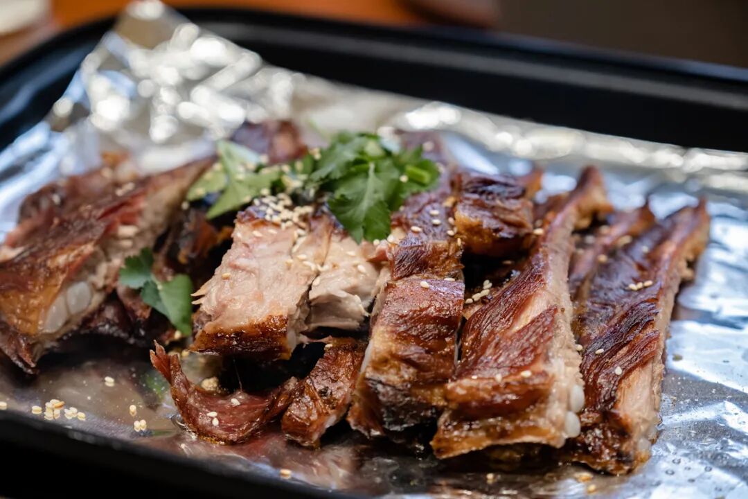 这道猪排采用类似于烤羊排的做法,先用烤箱高温急速烘烤后风干收汁,在上桌时再放在锡纸上加热慢烤,油花也被烤的滋滋作响,咸甜的淮扬风味蘸上辣椒面,让人惊喜。