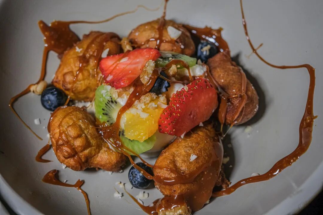 新鲜草莓,猕猴桃,蓝莓等维京地区产的水果放在橙子和香草味的冰淇淋上,就如同这些水果长在冰天雪地的北欧冻土。炸到金褐色南瓜饼混上奶油,软糯的口感包裹着新鲜的水果,这种风味的甜点小编倒是头一回吃到。