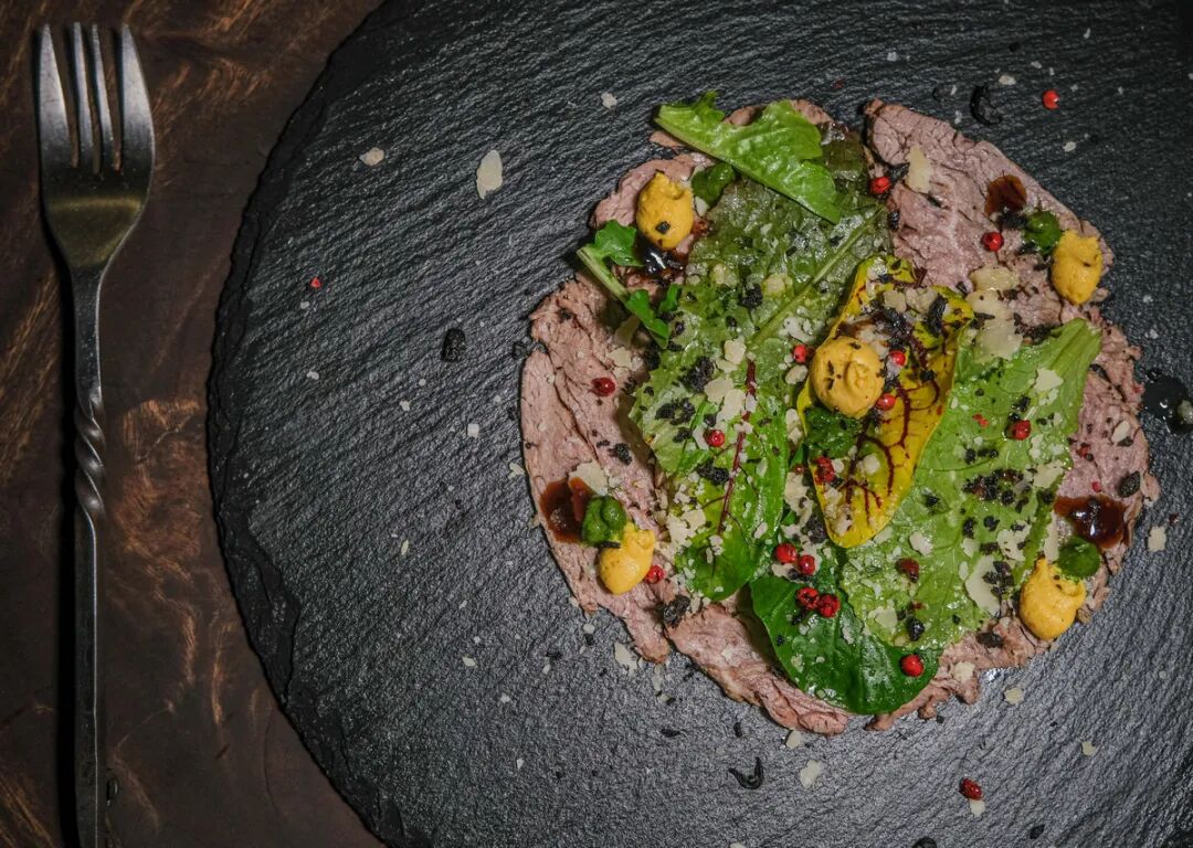 这是一道牛肉菜,用香草腌制过的牛肉片平铺在盘底,奶酪片撕在牛肉上,粗野的撒开蛋黄酱、松露酱、喜马拉雅粉红盐等配料,每一口都能吃到不一样的滋味。其中酸涩的小浆果将我们的胃口打开,这是一个完美的前菜。