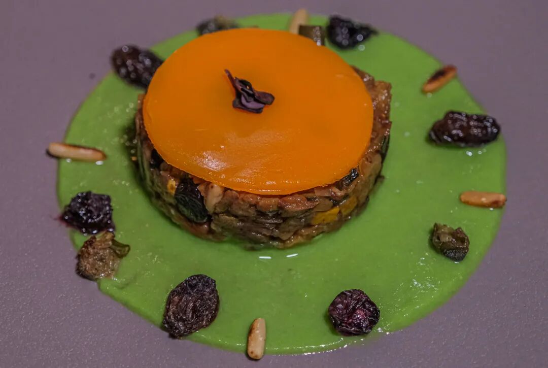 光吃肉的古代维京人明显已经不符合现代饮食科学理念。这道素食以清香的豌豆泥酱做底,顶部是橘色的胡萝卜泥,内馅是炒茄子和烤西葫芦、番茄和洋葱的mix,此外延边还有酸甜的梅子和坚果,可以说营养度爆表。虽然用到的食材众多,但搭配得却恰到好处,味道也非常令人满意。