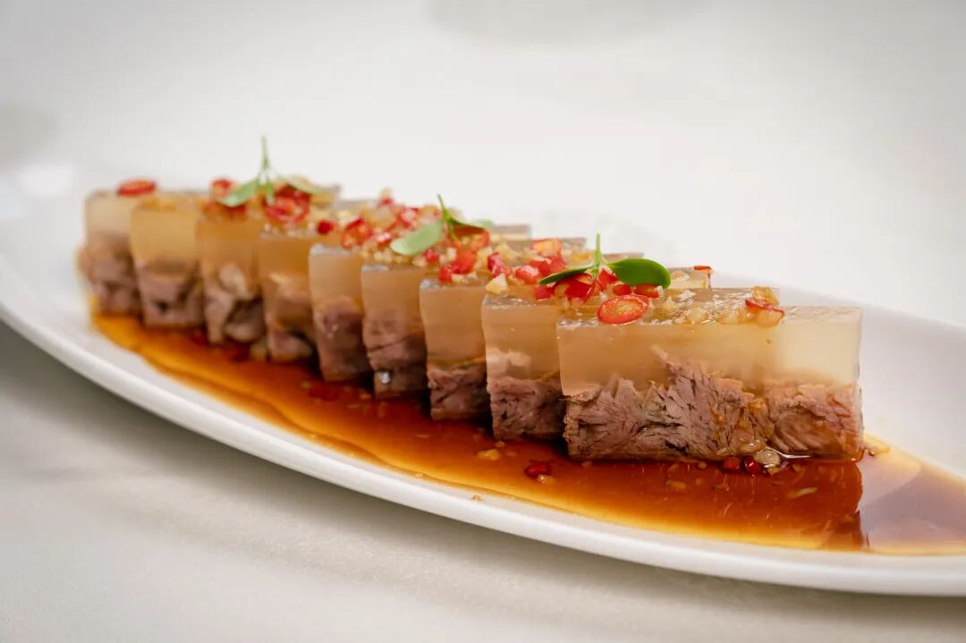 肴肉作为苏菜系中的名菜,完全可以成为你带上外国友人前来品尝的首选。根据本地风俗稍微改良了一下,食材采用的是牛小腱子肉,经小火长时间焖煮到酥烂,再冷凝塑形,淋上龙腾轩的秘制酱汁,入口清醇鲜香、滑爽却肥而不腻。