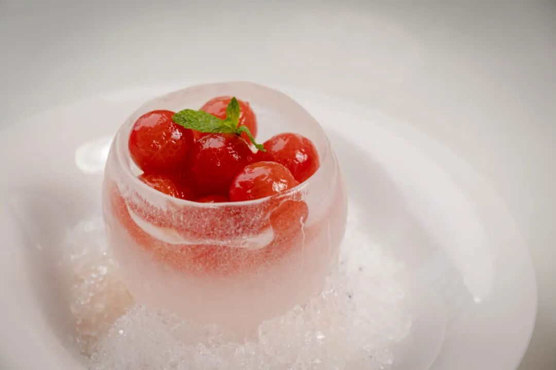 非常上相也美味的一道,本以为是冰镇西瓜球,但入口竟然是去皮的圣女果,加入了糖水淹渍和冰块容器放在一起,让我想起来小时候夏天妈妈拌的冰镇番茄的味道,但妙的是它还加入了淡淡的话梅香以及薄荷香,融合在一起 ,马上迪拜天气热来了可以点起来做开胃菜!
