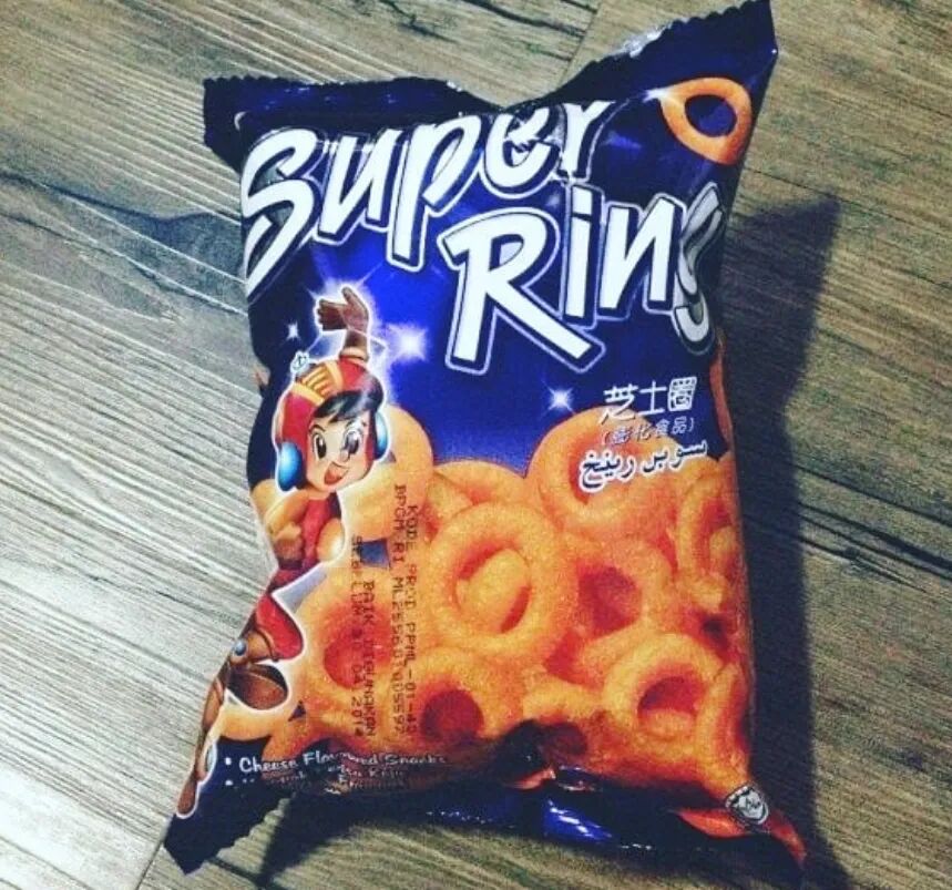 因为包装上“芝士圈”三个中文大字让我一度以为这款Super Ring是从中国引进的阿拉伯地区的,后来一查发现来自马来西亚一家名为Oriental的食品公司。是一种以洋葱圈为外形的芝士类膨化食品。在阿联酋,Super Ring和本土竞品Mr Krisps芝士球可谓不相伯仲,是盘踞在阿联酋Local小朋友心中的芝士双雄。