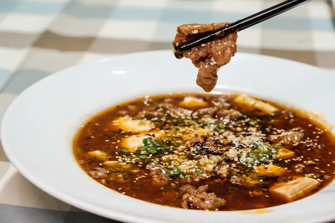 牛肉鲜嫩,连筷子夹起来都要小心翼翼,片片入味。豆腐也是滑嫩无比入口即化,一同浸入火辣的酱汁中。味道咸鲜香滑,尾调麻辣萦绕舌尖,爱吃辣的人,真是从舌尖到胃都是满满的巴适~