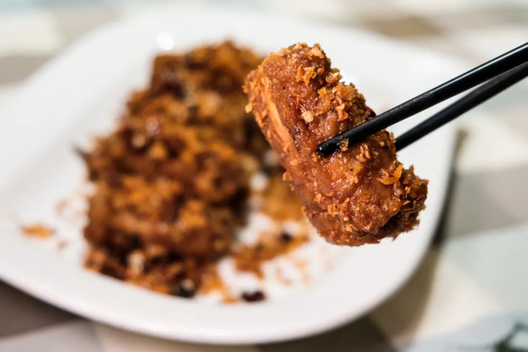 排骨在高温油锅里,与面包糠和辣椒一同炸制,外酥里嫩。面包糠的甜,干辣椒的辣,排骨的鲜,满满的一嘴鲜香浓郁。